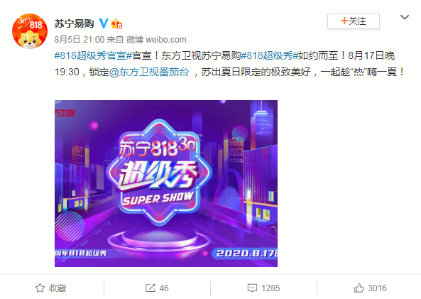 見圳客戶端·深圳新聞網(wǎng)2020年8月6日訊 昨晚,蘇寧易購官方微博發(fā)布消息稱,8月17日19:30,蘇寧易購30周年818超級秀將登陸東方衛(wèi)視。