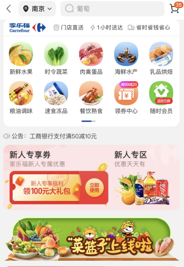 自8月8日起,消費(fèi)者通過蘇寧易購 APP、家樂福微信小程序等平臺,可以一鍵購買米面糧油、乳品烘焙、水產(chǎn)肉類、蔬菜水果等食物,SKU超過700個。很快,菜籃子也將在蘇寧小店APP上線。門店三公里范圍內(nèi)的訂單,最快25分鐘便可送到家。目前,菜籃子已經(jīng)覆蓋了51座城市的215家家樂福門店。