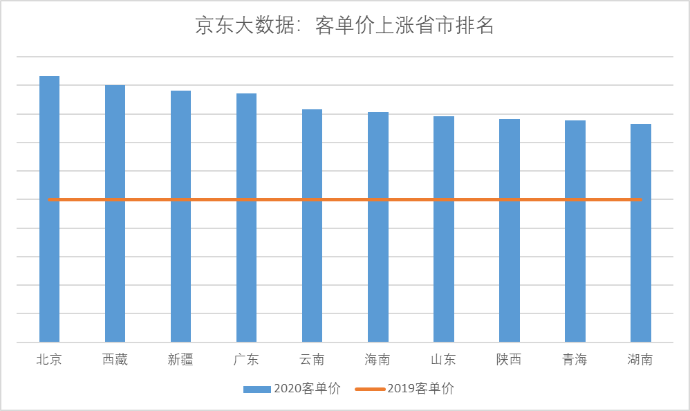 但是,消費(fèi)者采購月餅時卻呈現(xiàn)出更積極的上升趨勢:據(jù)京東大數(shù)據(jù),今年京東平臺上不但用戶數(shù)大幅增加,其中相當(dāng)大部分新用戶來自低線市場用戶,而且消費(fèi)者相比去年更加追求品質(zhì),大品牌、高規(guī)格的月餅禮盒熱銷,因此月餅平均客單價比去年上漲了35%以上。下圖可見,除北京廣東等發(fā)達(dá)地區(qū)外,客單價上漲的主要動力來自于西北、西南和華中等地區(qū)。