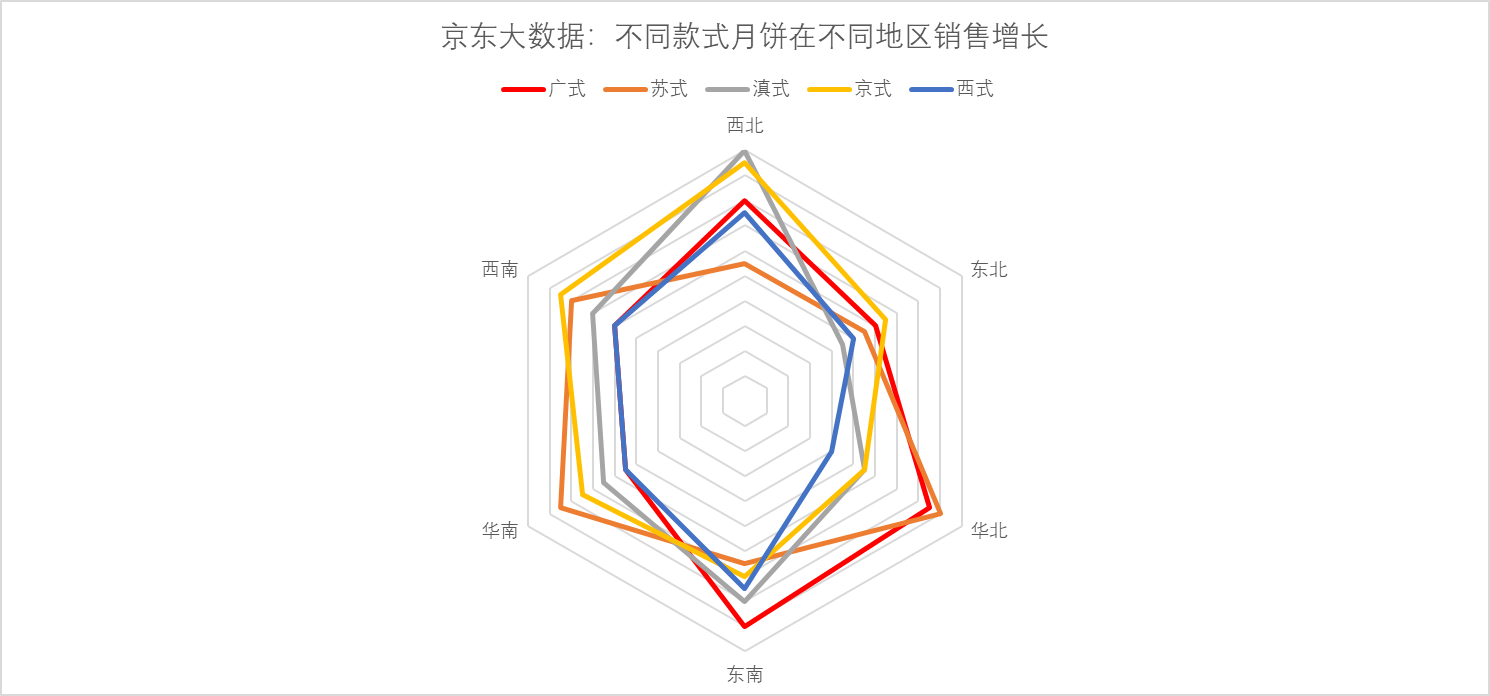 此前有報告顯示,消費(fèi)者購買月餅渠道更多樣化,已然形成線上為主、線下為輔的趨勢。而隨著京東渠道的滲透、物流的下沉,很多偏遠(yuǎn)地區(qū)的線上消費(fèi)比例也越來越大,比如西北地區(qū)消費(fèi)者購買廣式和京式月餅的同比增長分別達(dá)160%和190%,線上銷售的方式打破了區(qū)域間的地理限制,跨區(qū)域嘗鮮成為潮流,而且促進(jìn)了全國各地節(jié)( chi)日( huo)的交流。