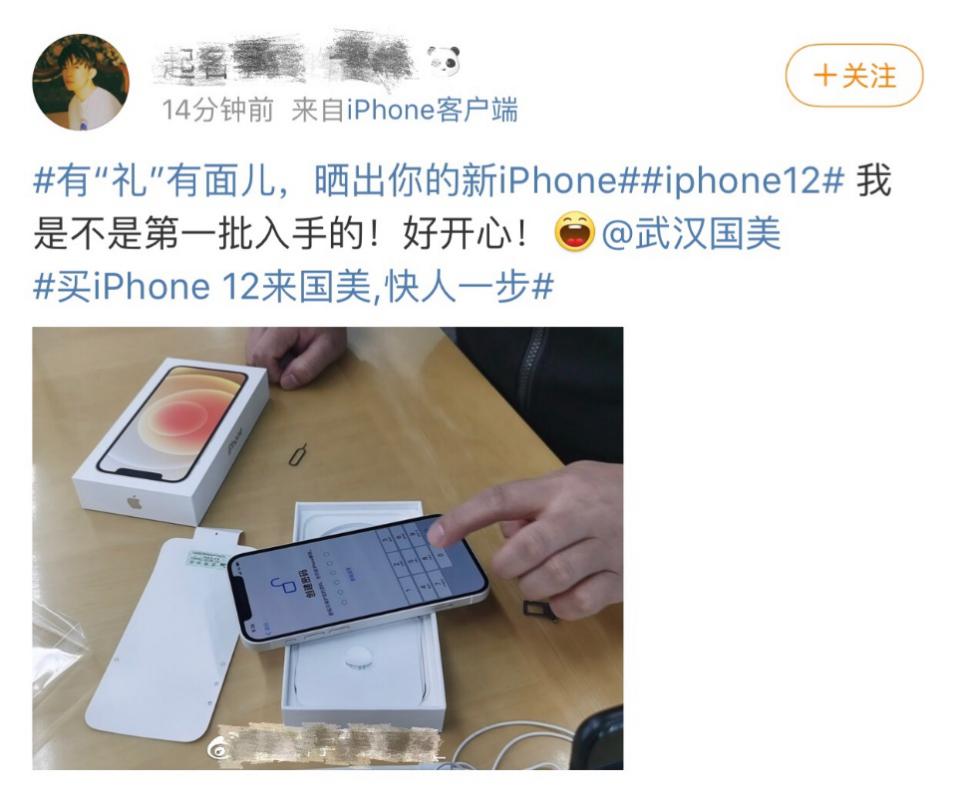 還有“果粉”在收到國(guó)美閃電配送的iPhone12后,第一時(shí)間就微博曬新機(jī):“我是不是第一批入手的!好開心!”還配上了一個(gè)張iPhone12拍出的新鮮出爐的大片。馬上就有跟帖說:“你就是微博今日最佳最靚的仔!”。