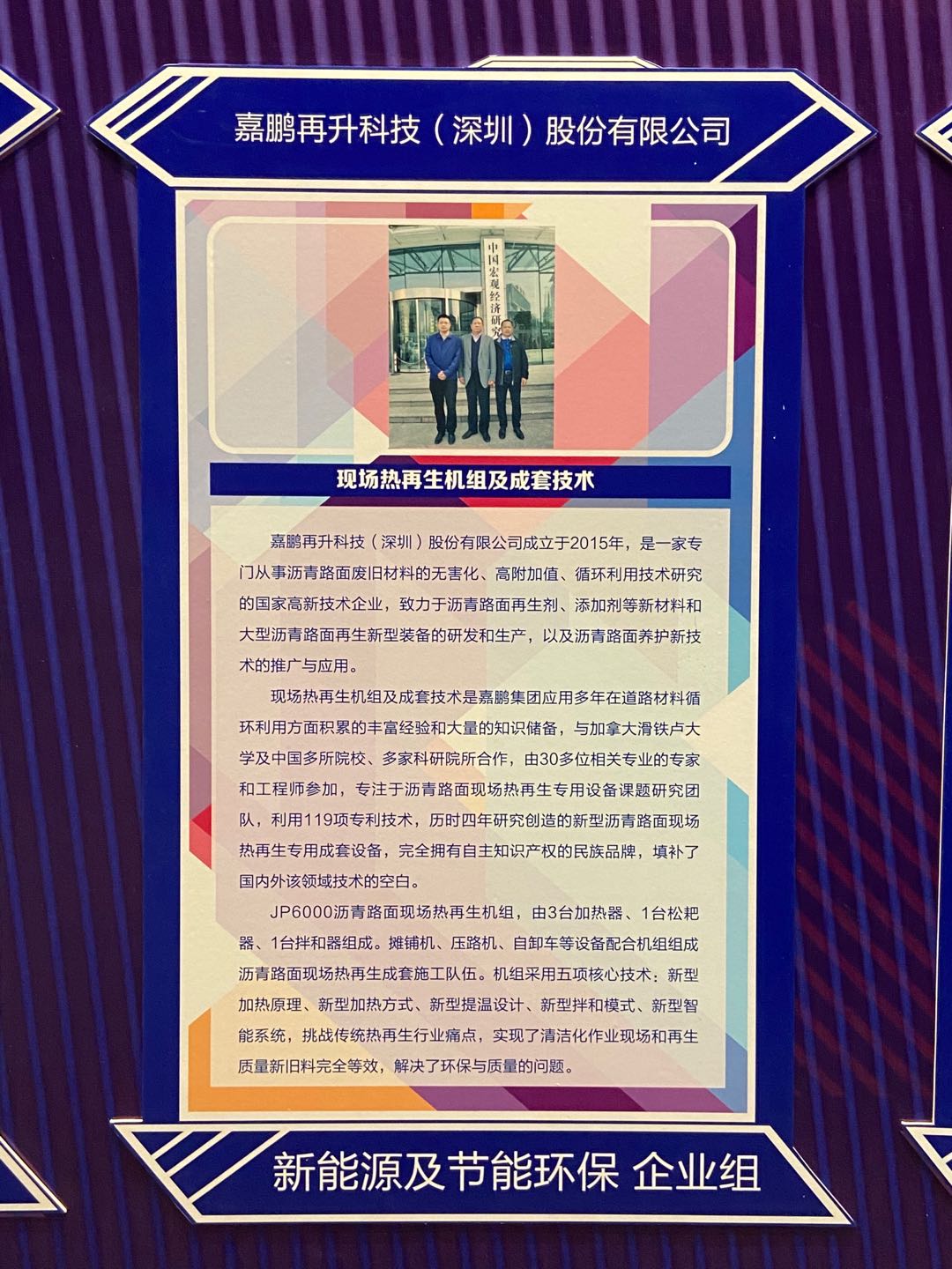 其中嘉鵬再升科技(深圳)股份有限公司“現(xiàn)場(chǎng)熱再生機(jī)組及成套技術(shù)”獲得新能源及節(jié)能環(huán)保行業(yè)一等獎(jiǎng),作為企業(yè)組代表接受采訪。