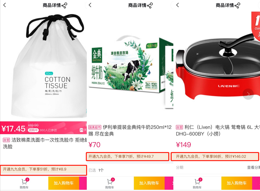 其中,原價(jià)19.9元的潔致綿柔洗臉巾只需8.9元即可到手,會(huì)員用戶(hù)在享受會(huì)員日常價(jià)基礎(chǔ)上,疊加享受5.1折;伊利金典純牛奶原價(jià)70元,九九會(huì)員可享受7.1折,49.7元就能到手;原價(jià)149元的利仁電火鍋,九九會(huì)員可享受9.8折,到手價(jià)146.02元。此外,部分小家電產(chǎn)品還可領(lǐng)取滿500減50、滿800減80等滿減優(yōu)惠券,享受折上折。