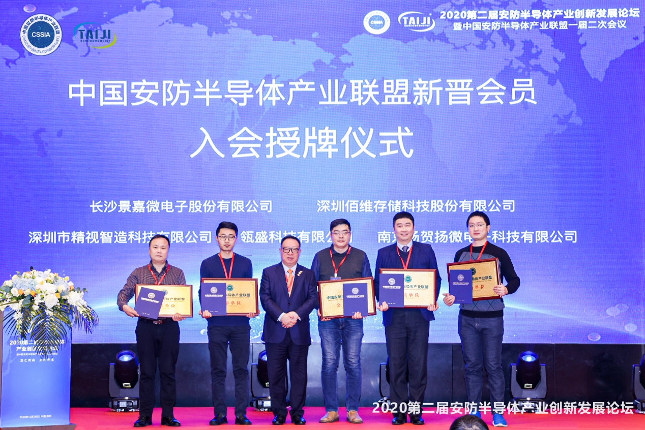 會議尾聲,還舉行了中國安防半導(dǎo)體產(chǎn)業(yè)聯(lián)盟新晉會員單位入會授牌儀式。深圳佰維存儲科技股份有限公司、長沙景嘉微電子股份有限公司榮膺聯(lián)盟理事單位,瓴盛科技有限公司、深圳市精視智造科技有限公司,南京揚(yáng)賀揚(yáng)微電子科技有限公司榮膺聯(lián)盟會員單位。中國安防半導(dǎo)體產(chǎn)業(yè)聯(lián)盟主席楊金才為以上單位進(jìn)行授牌。