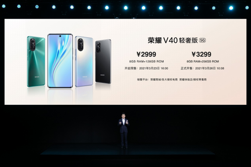 榮耀V40輕奢版擁有幻夜黑、藍(lán)水翡翠和鈦空銀三種配色,提供8GB+128GB、8GB+256GB兩個(gè)內(nèi)存版本,售價(jià)分別為2999元和3299元。3月26日10:08在線上線下全平臺(tái)開售,用戶可通過榮耀商城及各大授權(quán)電商平臺(tái)或前往榮耀線下體驗(yàn)店、榮耀授權(quán)零售門店進(jìn)行購買。