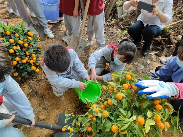 雍景城小區(qū)作為本次活動的主會場,現(xiàn)場熱鬧非凡。公明街道相關(guān)工作人員向光明區(qū)實驗學(xué)校師生、志愿者、物業(yè)等講解年花年桔回植活動的意義及安全事項,并分成三組開始種植活動,大家你扶綠植我培土,你摘果桔我澆水,揮灑辛勤的汗水,很快,70多棵年桔就“立”起來了,枝干上掛滿了種植人員留下的真切的寄語。東明公寓、傳麒山小區(qū)的種植現(xiàn)場同樣溫馨而快樂。
