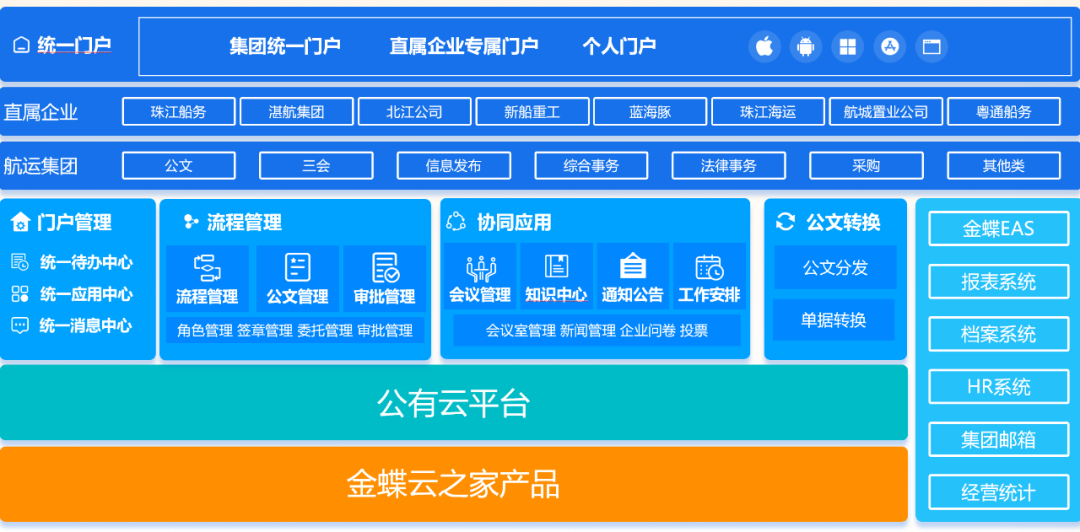 作為大型綜合性國(guó)企,廣東航運(yùn)集團(tuán)現(xiàn)有直屬企業(yè)8家,擁有全資、控股、參股及代理水路客運(yùn)港口13家,經(jīng)營(yíng)和管理96艘粵港澳高速客船。伴隨經(jīng)營(yíng)規(guī)模的發(fā)展、技術(shù)迭代、應(yīng)用場(chǎng)景深入,其信息化需要一個(gè)可以覆蓋集團(tuán)協(xié)同應(yīng)用場(chǎng)景的綜合辦公平臺(tái),而集團(tuán)原有的OA已經(jīng)無(wú)法滿足航運(yùn)的持續(xù)發(fā)展需要。