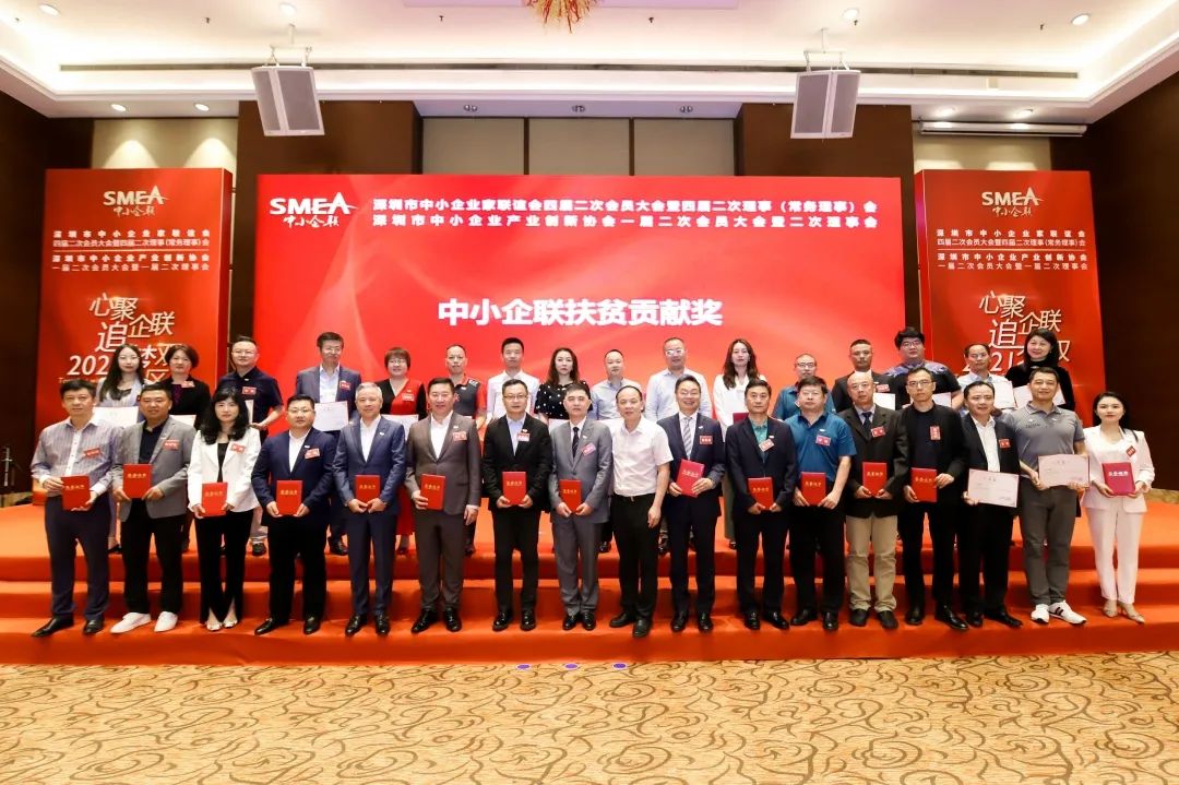 深圳市中小企業(yè)服務(wù)局副局長陳小林(左九)為獲得扶貧貢獻獎的企業(yè)家頒獎