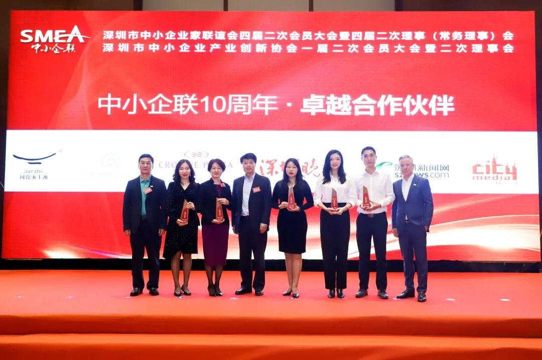 深圳市中小企業(yè)服務(wù)局副局長陳小林(左七)為獲得卓越貢獻獎的企業(yè)家頒獎
