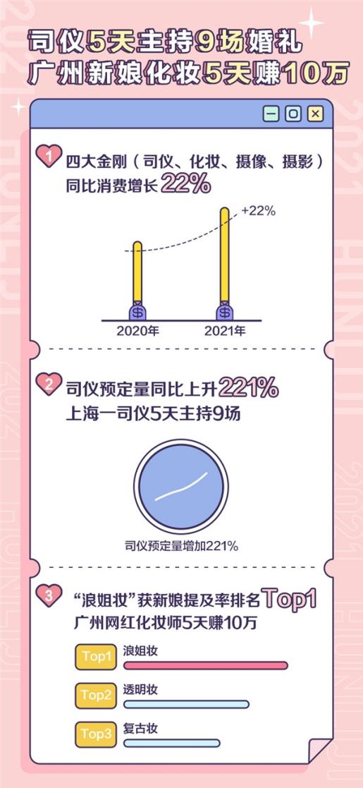 “快要忙瘋了,五一5天辦了150多場婚禮,第一天就有60場,去年這時候婚禮只有個位數(shù),今年我們員工都加班加點連夜趕工搭建場地。”婚禮紀商家Sunny喜鋪婚禮副總趙佳佳在接受采訪的時候表示,不僅商家忙,新人也非常忙,Z世代的新人都習(xí)慣于通過線上咨詢、直播下單等互聯(lián)網(wǎng)形式進行婚禮消費,省去了線下奔波的時間。