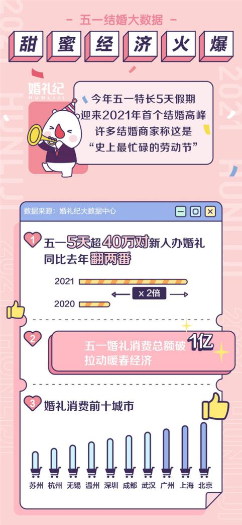 數(shù)據(jù)顯示,五一迎來2021年首個結(jié)婚高峰,5天內(nèi)超40萬對新人舉辦婚禮,同比去年翻兩番。五一婚禮消費總額破1億,在一定程度上拉動暖春經(jīng)濟?;槎Y消費前十城市分別是北京、上海、廣州、武漢、成都、深圳、溫州、無錫、杭州、蘇州。