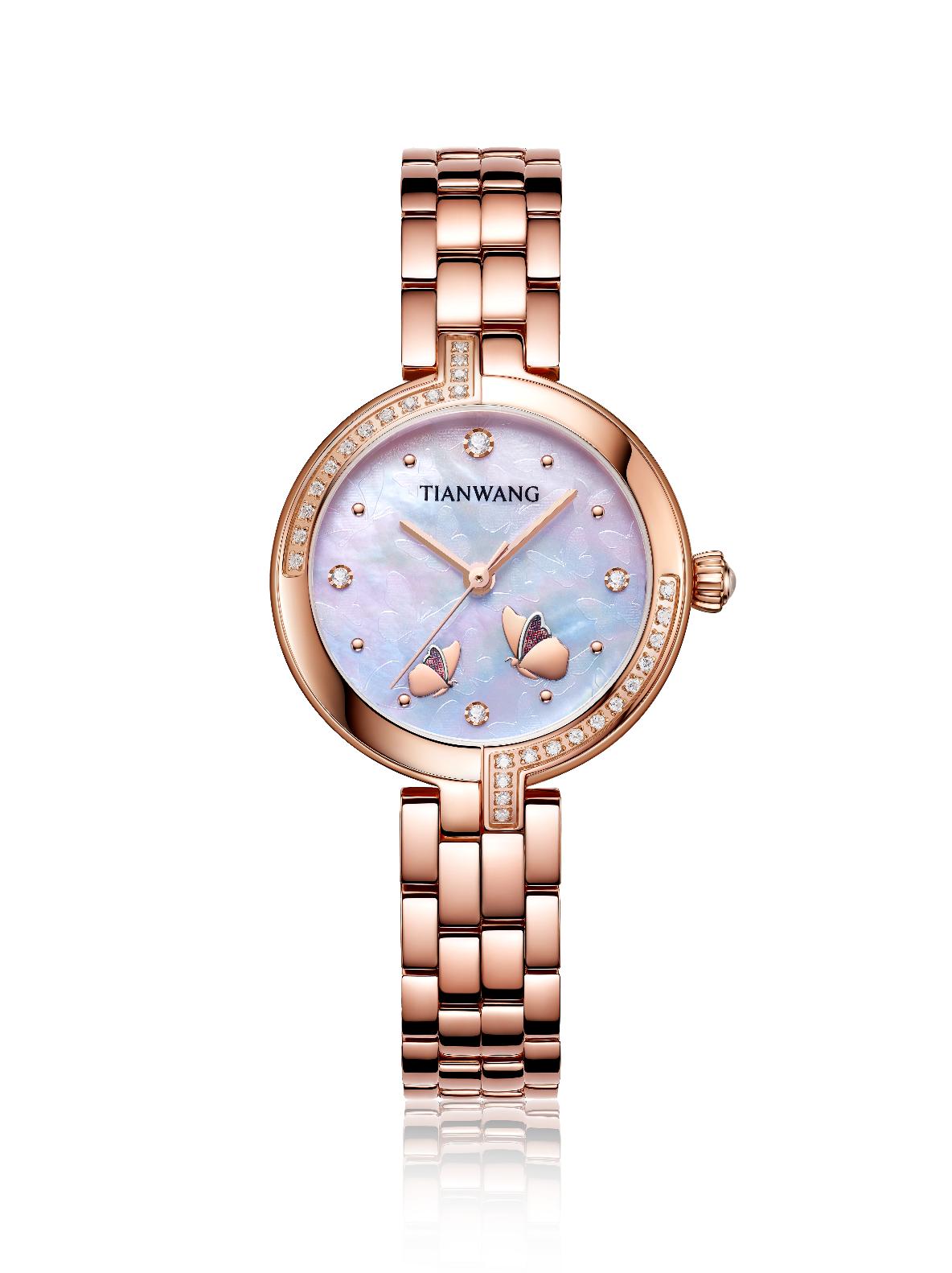 這次合作的腕表,沿襲了天王表的精品品質(zhì)和設(shè)計(jì)美學(xué),有點(diǎn)“小確幸”的風(fēng)格,整體很秀氣但是細(xì)節(jié)都誠意滿滿。表是蝴蝶的天空,指針是蝴蝶的舞步。表盤采用蝴蝶壓印貝母,在藍(lán)寶石玻璃表鏡下,兩只立體蝴蝶翩然起舞,人如蝴蝶,蝴蝶像人,都迷戀這花花世界,想要縱情暢游其中。腕表刻度和表圈由璀璨皓石點(diǎn)綴,3點(diǎn)、6點(diǎn)、9點(diǎn)、12點(diǎn)使用較大皓石,使得整個(gè)表盤錯(cuò)落有致,富有層次感。搭配夢幻南瓜把的,極具浪漫色彩。玫瑰金色不銹鋼表殼,給人以優(yōu)雅炫目之感,質(zhì)感鋼帶,光澤度明亮,搭配不銹鋼蝴蝶扣,錦上添花,佩戴效果自然舒適。