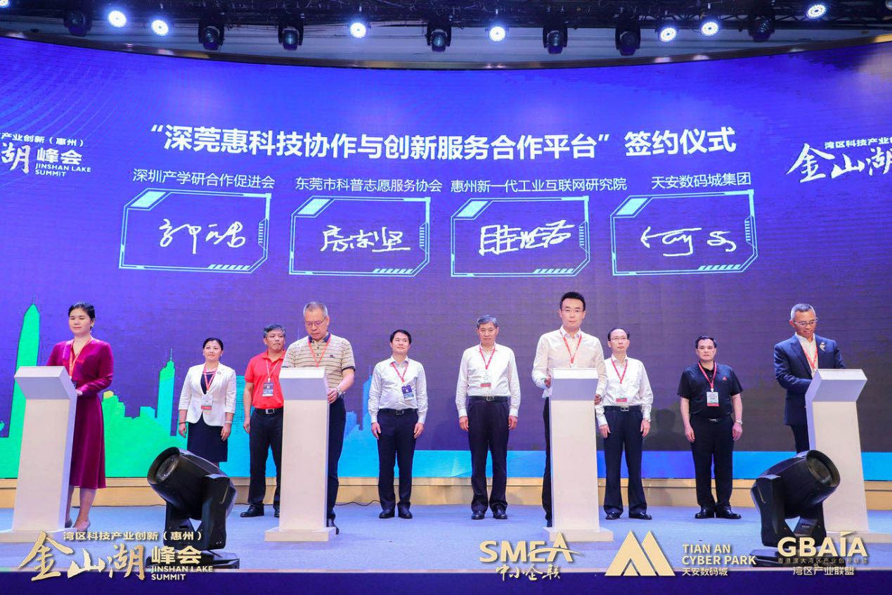 峰會當天,在廣東省科學技術(shù)協(xié)會黨組書記鄭慶順,惠州市委常委、市政府常務副市長何廣延,深圳市科學技術(shù)協(xié)會黨組書記林祥,東莞市科學技術(shù)協(xié)會一級調(diào)研員李小兵,惠州市科學技術(shù)協(xié)會黨組書記羅金星,惠州市科學技術(shù)協(xié)會主席費霞的見證下,深圳產(chǎn)學研合作促進會郭皓、東莞市科普志愿者協(xié)會房志堅、惠州新一代工業(yè)互聯(lián)網(wǎng)創(chuàng)新研究院眭世榮、惠州市天安數(shù)碼城有限公司何文共同上臺簽約,正式開啟深莞惠科技協(xié)作與創(chuàng)新服務新篇章。