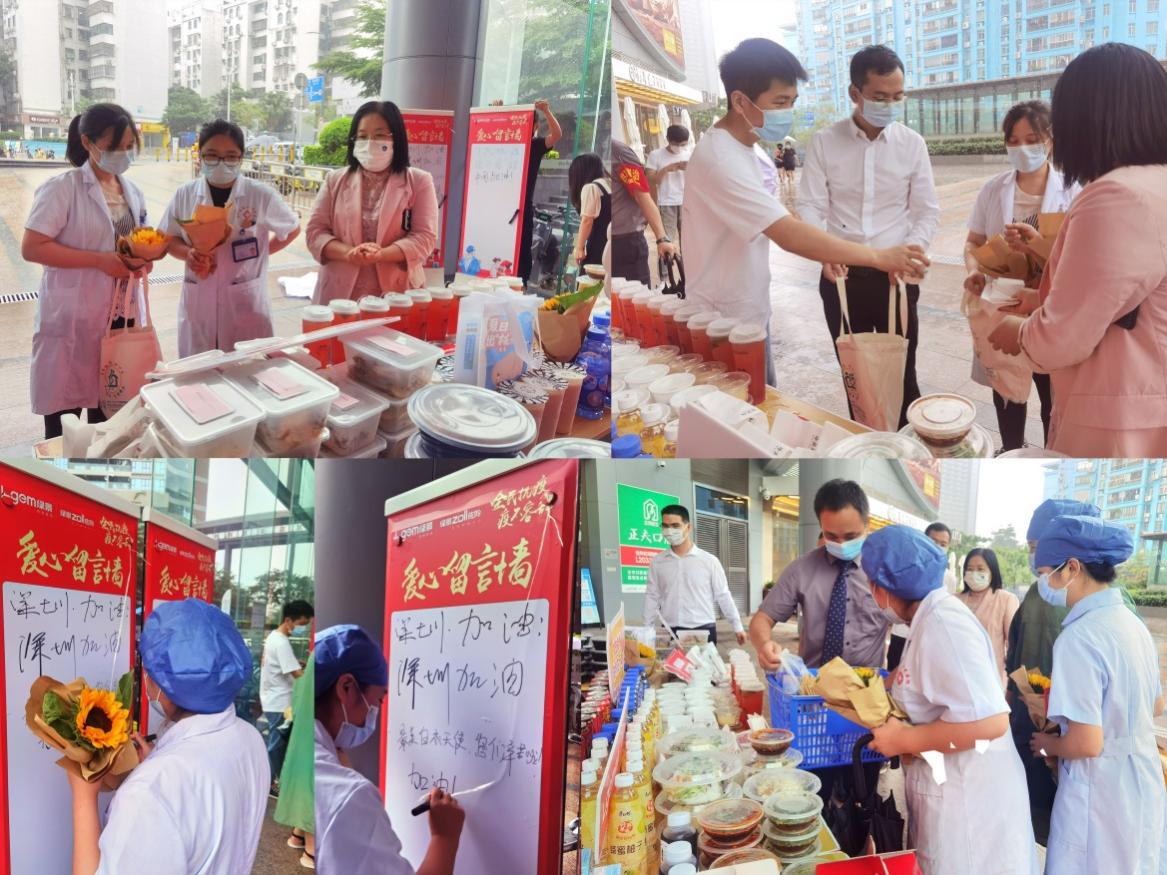 下梅林社區(qū)健康服務(wù)中心的護士小姐姐們,也在中午換崗的間隙,來到了活動現(xiàn)場挑選美食。護士小姐姐們非常高興地表示,在暴雨天不用等外賣,就可以享受暖心的美味午餐,可以留出更多的時間,回到崗位工作,繼續(xù)“戰(zhàn)疫”!其中還有一位可愛的護士小姐姐為給自己加油打氣,在愛心留言墻上,寫下了“加油!我們是最棒的!”