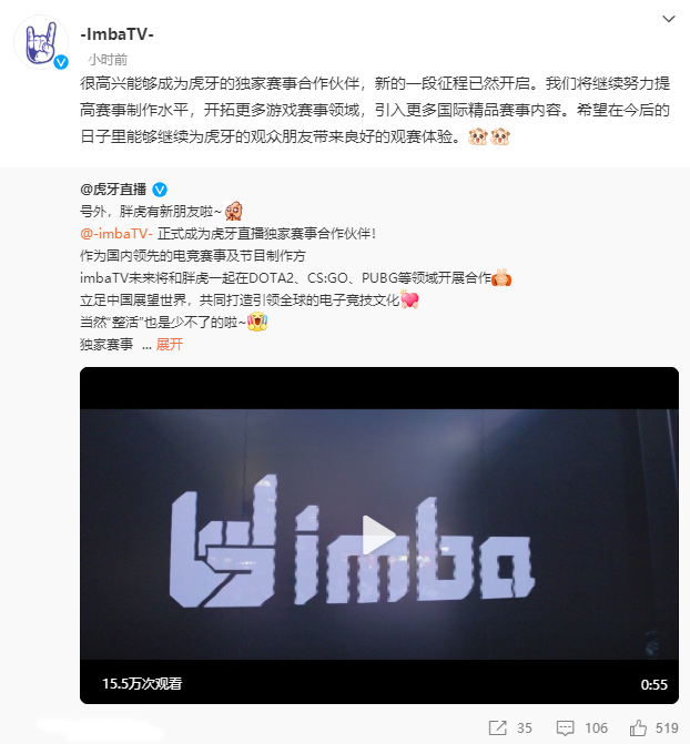 本次虎牙公司和imbaTV達成合作,不僅能加強雙方在DOTA2、CS:GO、PUBG等品類賽事上的優(yōu)勢,也與虎牙對電競賽事多元布局的計劃高度契合。