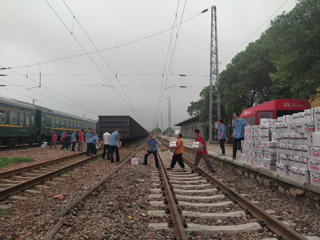 在第二批物資車隊(duì)駛出倉(cāng)庫(kù)的同時(shí),第三批滿載540多箱食品和礦泉水的京東物流車涉水抵達(dá)K226/7次列車臨時(shí)停靠的鄭州鐵爐站,為仍在滯留的數(shù)百名旅客送去應(yīng)急物資。