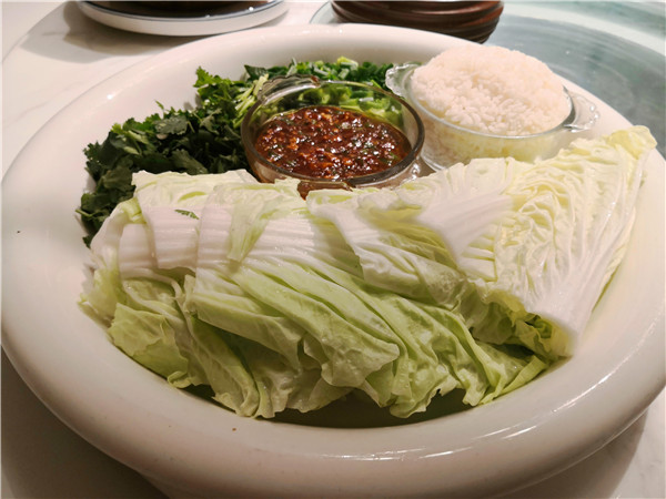 尤其扎眼的,正對(duì)大門(mén)的明廚亮灶上的幾塊牌匾,一下子就勾起人的食欲:老式熏豬手、手工燒老雞、烏蘇里江鰉魚(yú)、興凱湖大白魚(yú)、查干湖胖頭魚(yú)、火夫灶羊腿。這些都是地道的東北味啊!據(jù)介紹,老板湯長(zhǎng)明是黑龍江“龍菜”系傳承領(lǐng)軍人物,祖孫四代傳承東北菜廚藝,現(xiàn)在關(guān)東大院餐飲集團(tuán)董事長(zhǎng)。當(dāng)然,許多大家耳熟能詳?shù)拇蟊姴艘矐?yīng)有盡有,如:殺豬菜、小雞燉蘑菇、得莫利燉魚(yú)、大鵝燉寬粉、黑皮肘子、酸菜粉、地三鮮、東北鹵水點(diǎn)豆腐、金湯遼參、黃魚(yú)燒土豆、紅燒肉黃金勾......看得人口水直冒。加之,整個(gè)門(mén)店的布局也十分特別,一樓明廚亮灶之外,主要是大堂散座,周邊還有不少的書(shū)籍、酒架;二樓主要是包間,簡(jiǎn)潔明亮??梢哉f(shuō),在此可以感受到一股濃濃的關(guān)東風(fēng)情。