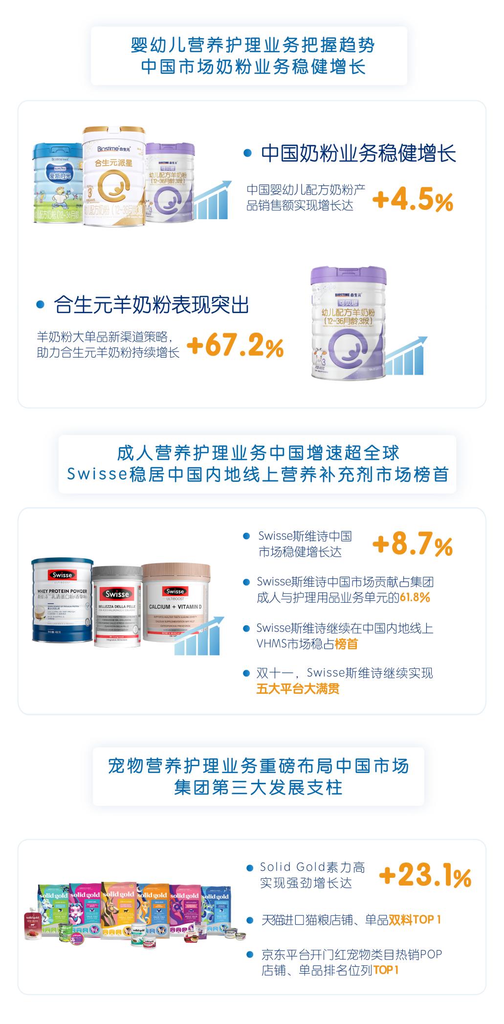 其中,嬰幼兒營(yíng)養(yǎng)及護(hù)理用品業(yè)務(wù)單元(BNC)中的中國(guó)市場(chǎng)奶粉業(yè)務(wù)銷售額實(shí)現(xiàn)4.5%增長(zhǎng);成人營(yíng)養(yǎng)及護(hù)理用品業(yè)務(wù)單元(ANC)銷售額全球升勢(shì)明顯,達(dá)5.8%,其中ANC中國(guó)市場(chǎng)增幅達(dá)8.7%;寵物營(yíng)養(yǎng)及護(hù)理用品業(yè)務(wù)單元(PNC)營(yíng)收達(dá)3.45億元,Solid Gold素力高同比增長(zhǎng)達(dá)23.1%, PNC中國(guó)市場(chǎng)在PNC業(yè)務(wù)單元占比41.1%。