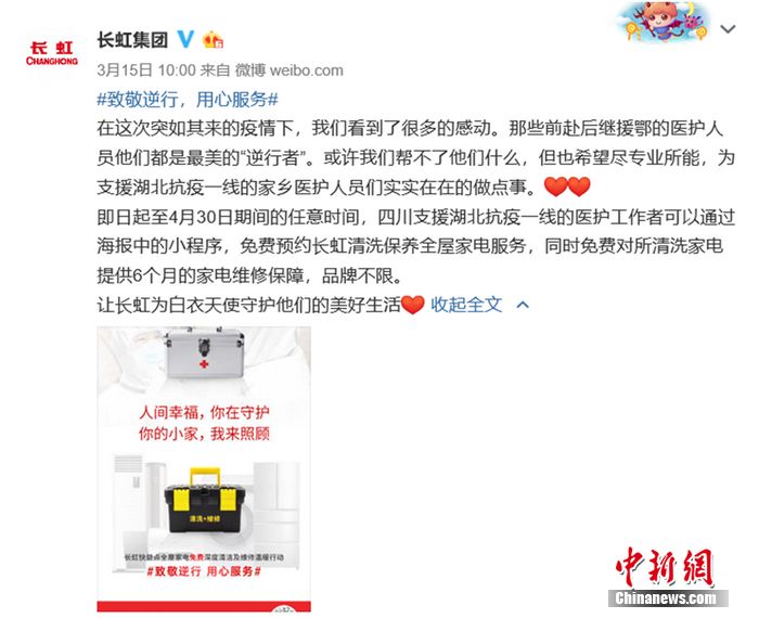 昨日,記者從長(zhǎng)虹集團(tuán)官方微博獲悉,長(zhǎng)虹快益點(diǎn)將為支援湖北抗疫一線的四川醫(yī)護(hù)工作者免費(fèi)清洗保養(yǎng)全屋家電,包括不限品牌的空調(diào)、冰箱、洗衣機(jī)、抽油煙機(jī)、電熱水器等。該項(xiàng)“特別福利”最高價(jià)值超過(guò)1800元,醫(yī)護(hù)工作者即日起可在4月30日前的任意時(shí)間預(yù)約。