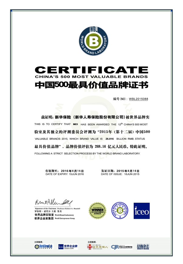 世界品牌實驗室(World?Brand?Lab)發(fā)布2015年(第十二屆)《中國500最具價值品牌》排行榜。新華保險品牌價值為268.16億元,同比提升逾40億元;位居榜單第88名,比去年晉升3位,連續(xù)三年穩(wěn)居中國前100強。