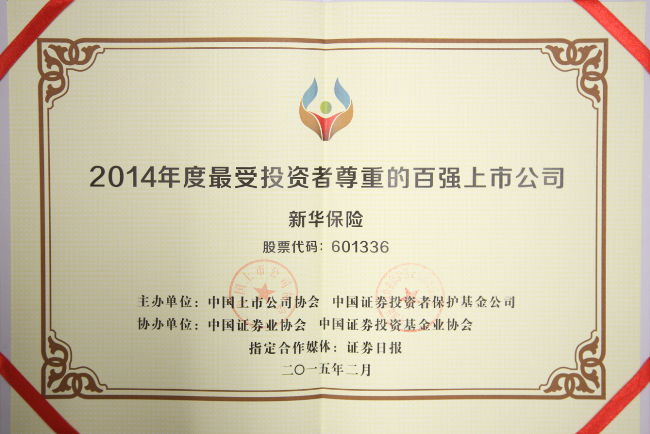 2015年2月,在中國上市公司協(xié)會、中國證券投資者保護基金公司主辦,中國證券業(yè)協(xié)會、中國證券投資基金業(yè)協(xié)會協(xié)辦的評選中,新華保險獲得2014年度最受投資者尊重的百強上市公司。