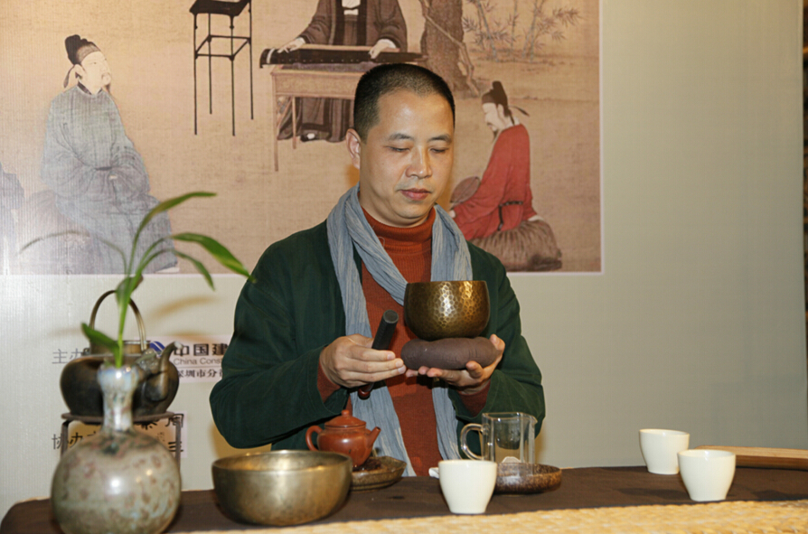 周三茶會的經(jīng)行禪茶創(chuàng)始人汪林生在進行禪茶表演
