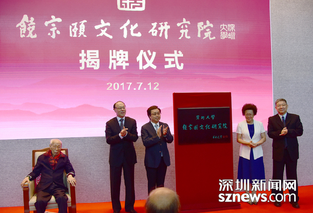 在饒宗頤教授的見證下,李小甘、吳以環(huán)、劉洪一、李清泉共同為深圳大學(xué)饒宗頤文化研究院揭牌。