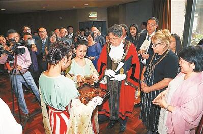 ▲劍橋市長杰芮米·本斯特德及夫人接受唐式茶禮。