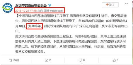 據(jù)市交委于2016年10月21日發(fā)布的通告稱(chēng),沙河西路與西部通道側(cè)接線工程(即東濱路隧道匝道工程)的施工時(shí)間計(jì)劃為2016年10月20日凌晨0:00時(shí)起至2017年4月18日,為期半年。期間將封閉沙河西從路南行s3廣深沿江高速進(jìn)口及s3東行東濱路出口。