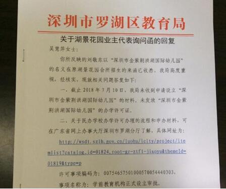 6月16日,市民在深圳論壇以《舉報(bào)湖景花園會(huì)所開辦幼兒早教班違法招生》為題發(fā)帖反映,羅湖區(qū)湖景花園第四屆業(yè)主委員會(huì)于2018年7月曾去函羅湖區(qū)教育局,詢問“深圳金紫荊洪湖國際幼兒園”是否具備招生資格。教育局明確回復(fù):未收到該幼兒園的申請(qǐng)資料,也未發(fā)放該園的辦學(xué)許可。