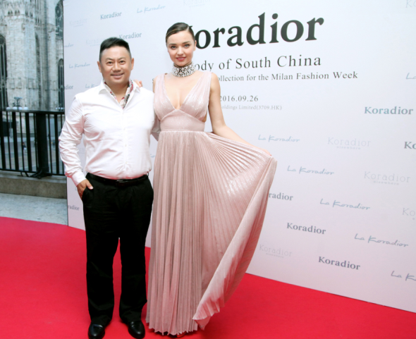 現(xiàn)任贏家時尚控股有限公司董事局主席金明先生和米蘭達可兒在2017年米蘭時裝周Koradior發(fā)布秀背景板合影