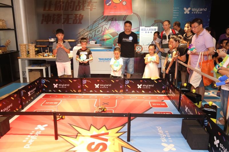 “我跟你說噢,那邊吹出來的泡泡能把我們倆都包進去!”“老媽,原來空氣的形狀是圓環(huán)形的呀……”歡聲笑語中,十幾項科技趣味項目讓小朋友們眼花繚亂、目不暇接,這其中,機器人對抗賽無疑是人氣最高的。賽場上,小朋友們分為紅藍兩隊,手持遙控器在兩側站好?!靶∨笥褌冏⒁饫玻恳晃粰C器人身上有一個藍色燈柱,碰撞擋板被撞到后,燈柱長度會縮短……”老師一邊在“戰(zhàn)場”中擺放機器人,一邊為孩子們詳細講解規(guī)則。一聲哨響,紅藍兩隊的“機器人大戰(zhàn)”拉開了帷幕,孩子們操控著自己的戰(zhàn)車,左右閃躲,時而用一個漂亮的側移甩掉追擊者,時而全力沖擊消耗對方的“藍條”。賽場邊的家長們似乎比小選手更為緊張,他們時不時俯下身子,為孩子們出謀劃策:“小超你看,邊上那個三號車藍條快沒了,快趕過去補一下!”一位父親看到了打破僵局的好機會,急忙提醒道,小朋友則心領神會,熟練的操縱著機器人貼了上去……經過一番努力,在成功拿下這寶貴的一分后,小朋友回頭與自己的老爸相視一笑,父子二人之間的默契,在這一刻體現的淋漓盡致。