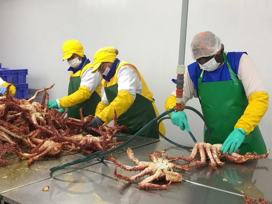 網(wǎng)友在蜘蛛蟹加工基地。湯有國(guó)攝