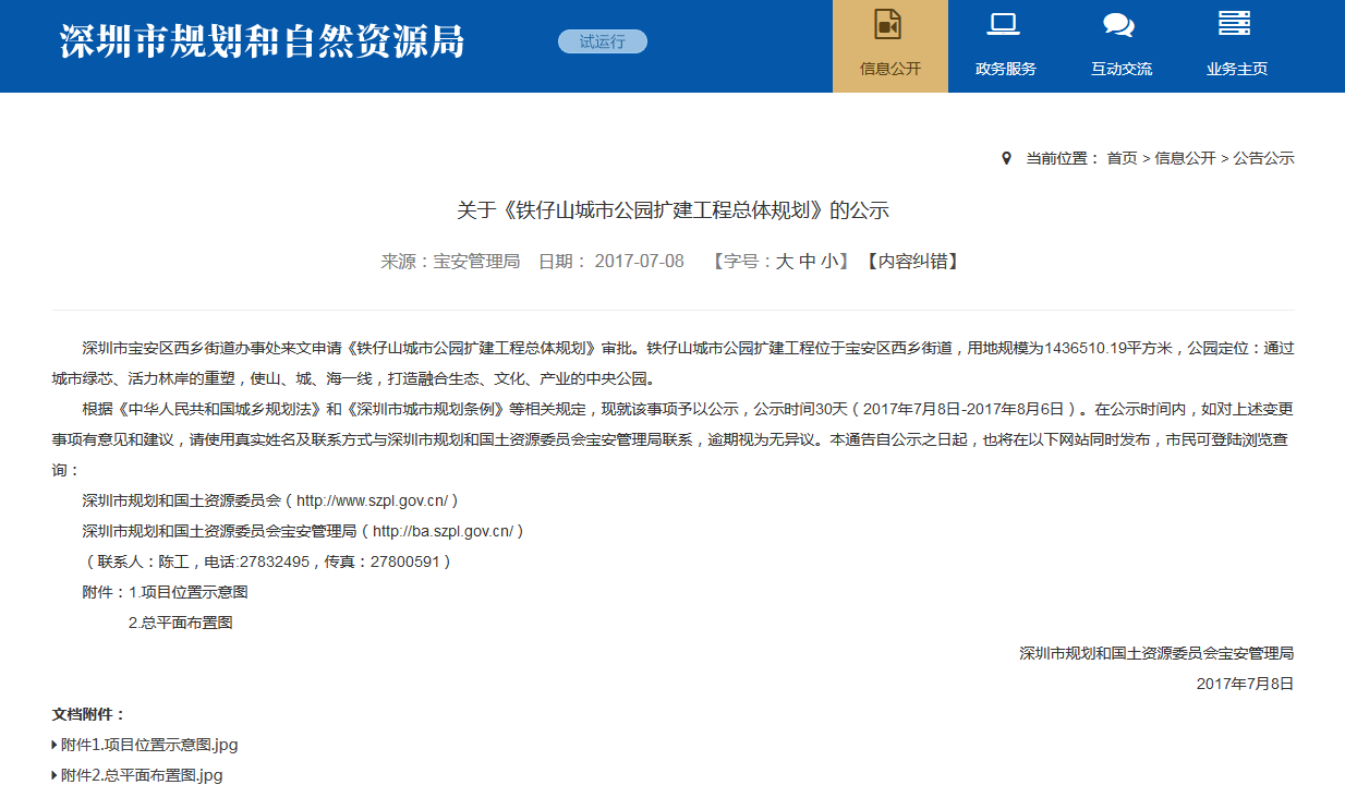 早在2017年,當時的市規(guī)土委曾經(jīng)在官方網(wǎng)站發(fā)布了《關(guān)于<鐵仔山城市公園擴建工程總體規(guī)劃>的公示》:深圳市寶安區(qū)西鄉(xiāng)街道辦事處來文申請《鐵仔山城市公園擴建工程總體規(guī)劃》審批。鐵仔山城市公園擴建工程位于寶安區(qū)西鄉(xiāng)街道,用地規(guī)模為1436510.19平方米,公園定位:通過城市綠芯、活力林岸的重塑,使山、城、海一線,打造融合生態(tài)、文化、產(chǎn)業(yè)的中央公園。