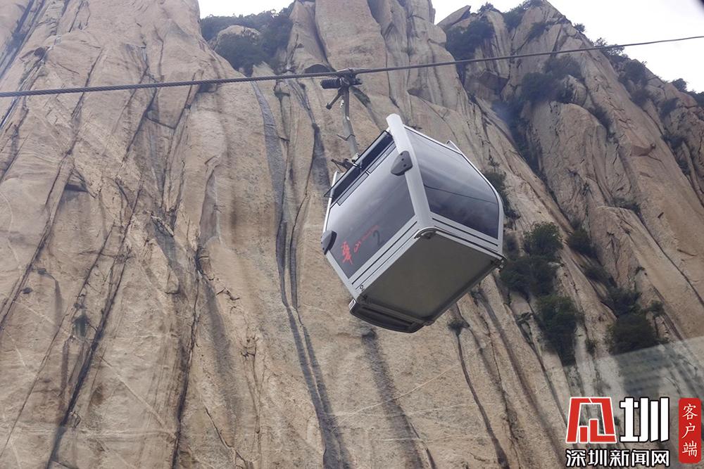 線路斜長(zhǎng)4211米,相對(duì)高差894米,單向運(yùn)量1500人/小時(shí)。華山索道一覽。李仁奇攝。