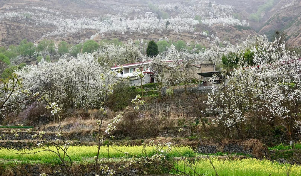 梨花叢中的村寨。李仁奇 攝