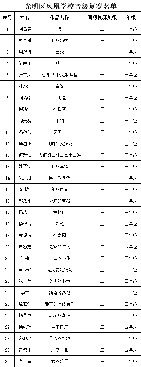 自2021年1月,活動征稿啟動以來,獲得了深圳市廣大中小學生、教師、文學愛好者的熱烈響應(yīng)積極參與,吸引了深圳百余所學校的上萬人關(guān)注報名。現(xiàn)公布深圳市光明區(qū)鳳凰學校專場晉級復賽名單如下: