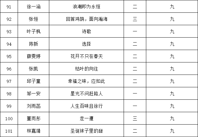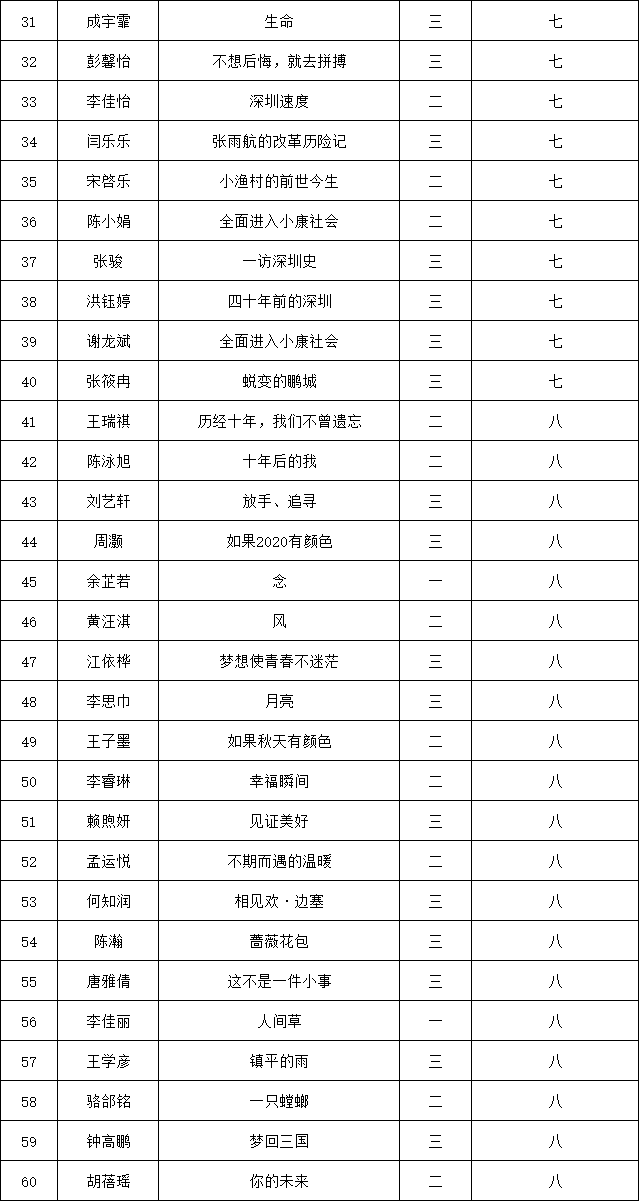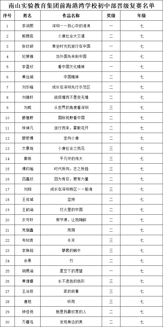 自2021年1月,活動(dòng)征稿啟動(dòng)以來,獲得了深圳市廣大中小學(xué)生、教師、文學(xué)愛好者的熱烈響應(yīng)積極參與,吸引了深圳百余所學(xué)校的上萬人關(guān)注報(bào)名?,F(xiàn)公布南山實(shí)驗(yàn)教育集團(tuán)前海港灣學(xué)校(初中部)專場(chǎng)晉級(jí)復(fù)賽名單如下: