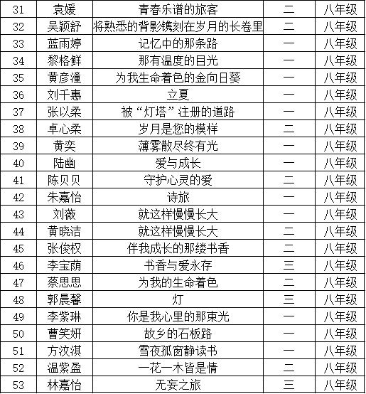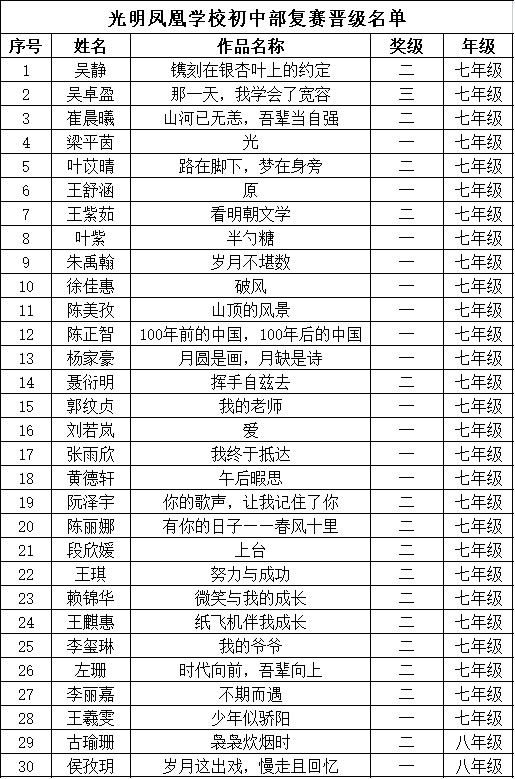 自2021年1月,活動(dòng)征稿啟動(dòng)以來(lái),獲得了深圳市廣大中小學(xué)生、教師、文學(xué)愛好者的熱烈響應(yīng)積極參與,吸引了深圳百余所學(xué)校的上萬(wàn)人關(guān)注報(bào)名。現(xiàn)公布光明區(qū)鳳凰學(xué)校晉級(jí)復(fù)賽名單如下: