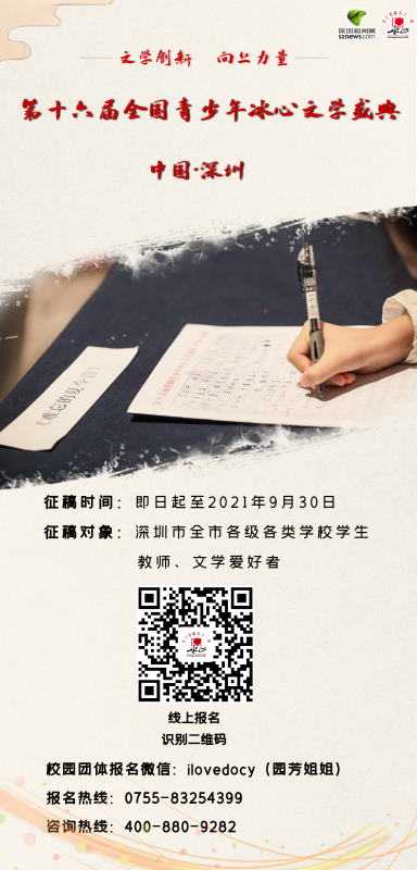 讀特客戶(hù)端·深圳新聞網(wǎng)2021年7月19日訊 為繼承和發(fā)揚(yáng)中華文化及冰心文學(xué)精神,促進(jìn)中華文化、中國(guó)現(xiàn)代化文學(xué)史更深入地植入深圳下一代青少年心中,2021年“第十六屆全國(guó)青少年冰心文學(xué)盛典中國(guó)·深圳”正在愛(ài)好文學(xué)的師生學(xué)友們之間熱烈展開(kāi)。