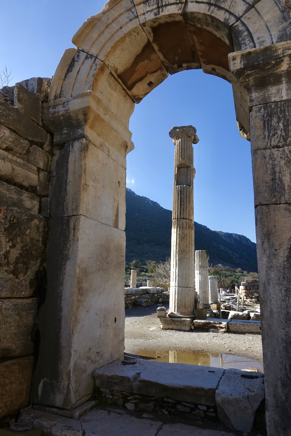 立柱背后是市政廳遺址。經(jīng)過(guò)幾百年的地貌變遷,以弗所的入??跐u漸被淤泥填塞,它賴(lài)以生存的海洋貿(mào)易遂告終結(jié),加上地中海沿岸頻發(fā)的地震,以弗所難逃被遺棄的噩運(yùn),這座新約《圣經(jīng)》中出現(xiàn)過(guò)的城市,最終淪為一片大理石廢墟。李仁奇 攝