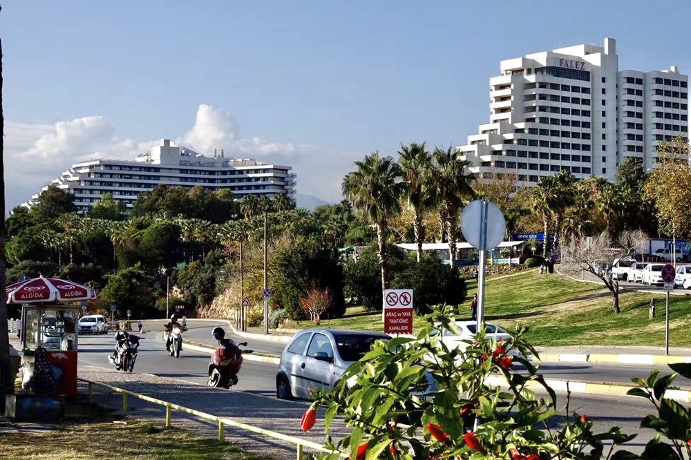 安塔利亞被群山環(huán)繞,成行的棕櫚樹構成一條條林蔭大道,西面是一望無際的拉拉沙灘,南瀕清澈的地中海,北臨郁郁叢叢的托羅斯山脈。市區(qū)人口約60萬,每年夏季有大量游客,特別是俄羅斯人涌入。李仁奇 攝