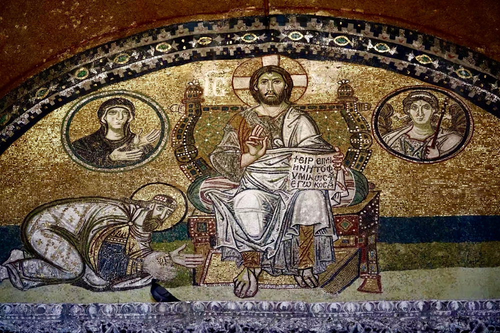 鑲嵌畫(huà)《全能的耶穌》。坐在寶座上的耶穌左手握著福音書(shū),上面用希臘文寫著:“賜予汝和平,我世界之光”。耶穌左邊是圣母瑪利亞,右邊是大天使,當(dāng)時(shí)的羅馬皇帝虔誠(chéng)的匍匐在耶穌面前。李仁奇 攝