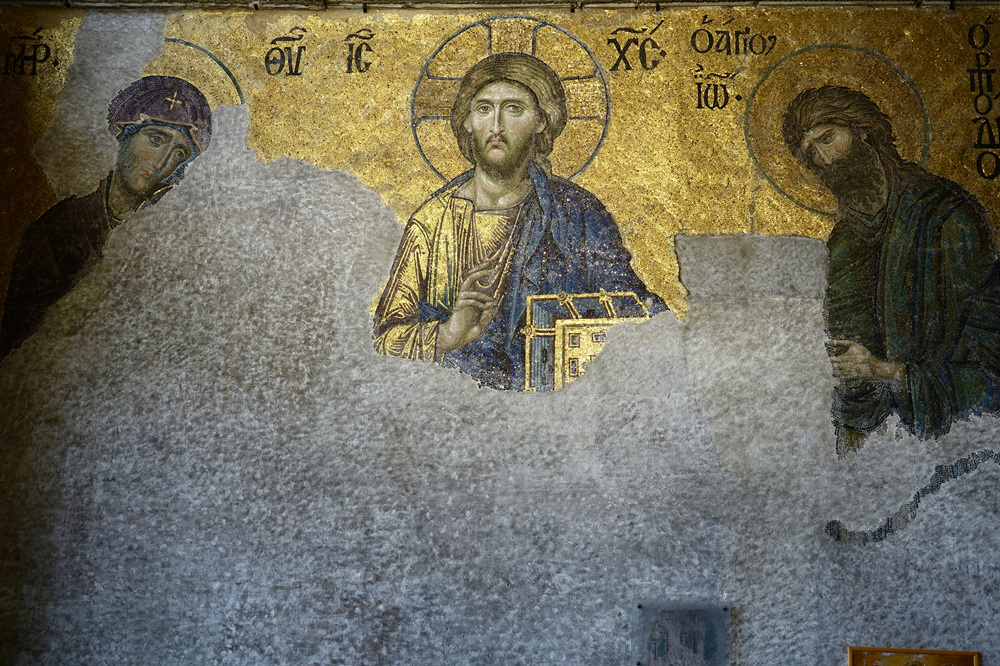 馬賽克《三圣像》,畫(huà)面下方已經(jīng)被嚴(yán)重?fù)p毀,但仍然能看到中央的耶穌基督,其兩側(cè)是圣母瑪利亞和施洗者約翰。李仁奇 攝