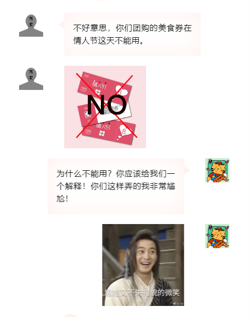 遇到春節(jié)、情人節(jié)等特殊時(shí)期,消費(fèi)者在團(tuán)購時(shí)應(yīng)當(dāng)看清使用期限,如商家未提前說明美食券的限用日期,而是去到現(xiàn)場(chǎng)才告知消費(fèi)者不能使用,則商家涉嫌侵害消費(fèi)者的知情權(quán)、公平交易權(quán)。如商家銷售美食券的頁面,注明情人節(jié)不能使用,此時(shí)商家盡到了提醒義務(wù),消費(fèi)者可在規(guī)定的其他時(shí)間內(nèi)使用美食券,或者向平臺(tái)申請(qǐng)退款。(消費(fèi)提示:消費(fèi)者購買團(tuán)購券時(shí),要仔細(xì)閱讀團(tuán)購頁面的使用說明,特別是要仔細(xì)瀏覽團(tuán)購券使用時(shí)限。限用人數(shù)等具體內(nèi)容,避免遭遇買了卻用不了的困境。)