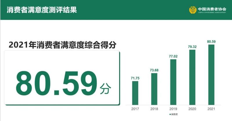 測(cè)評(píng)結(jié)果顯示,2021年度100個(gè)城市消費(fèi)者滿意度綜合得分為80.59分,較2020年提高1.27分,且首次突破80分。