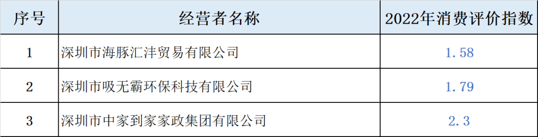備注:本排名依據(jù)深圳市消委會“315消費通”平臺2021年2月1日至2022年1月31日期間,家政行業(yè)年投訴量3宗以上經(jīng)營者消費評價指數(shù)從高到低排序。