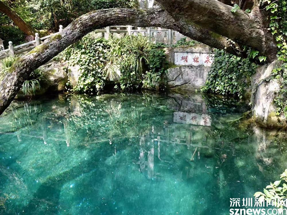 蝴蝶泉水清澈如鏡,水石相映,樹影搖晃。西壁上方鐫刻著郭沫若題寫的“蝴蝶泉”三個大字。池邊的蝴蝶樹,猶如一條青龍橫臥于泉池上。李仁奇 攝