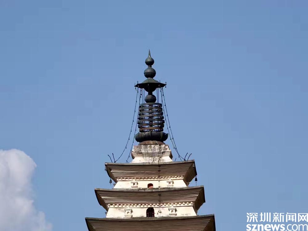 在千尋塔的塔頂四角,原來鑄有4只巨大的金翅鳥,“金翅鳥”又名“大鵬金翅鳥”,為佛教護法神中的“天龍八部”之一,傳說能鎮(zhèn)水患,后毀于地震。李仁奇 攝