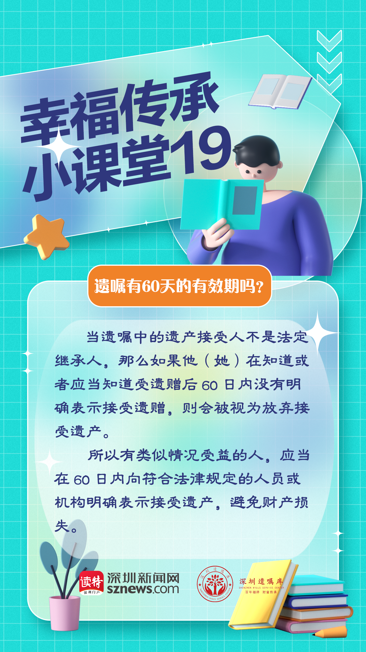 讀特客戶端·深圳新聞網(wǎng)2022年11月14日訊(記者 張玲 翁任瑩)遺囑是有有效期的,60天。當遺囑中的遺產(chǎn)接受人不是法定繼承人,那么在他(她)知道或者應當知道受遺贈后60日內(nèi)沒有明確表示接受遺贈,則會被視為放棄接受遺產(chǎn)。